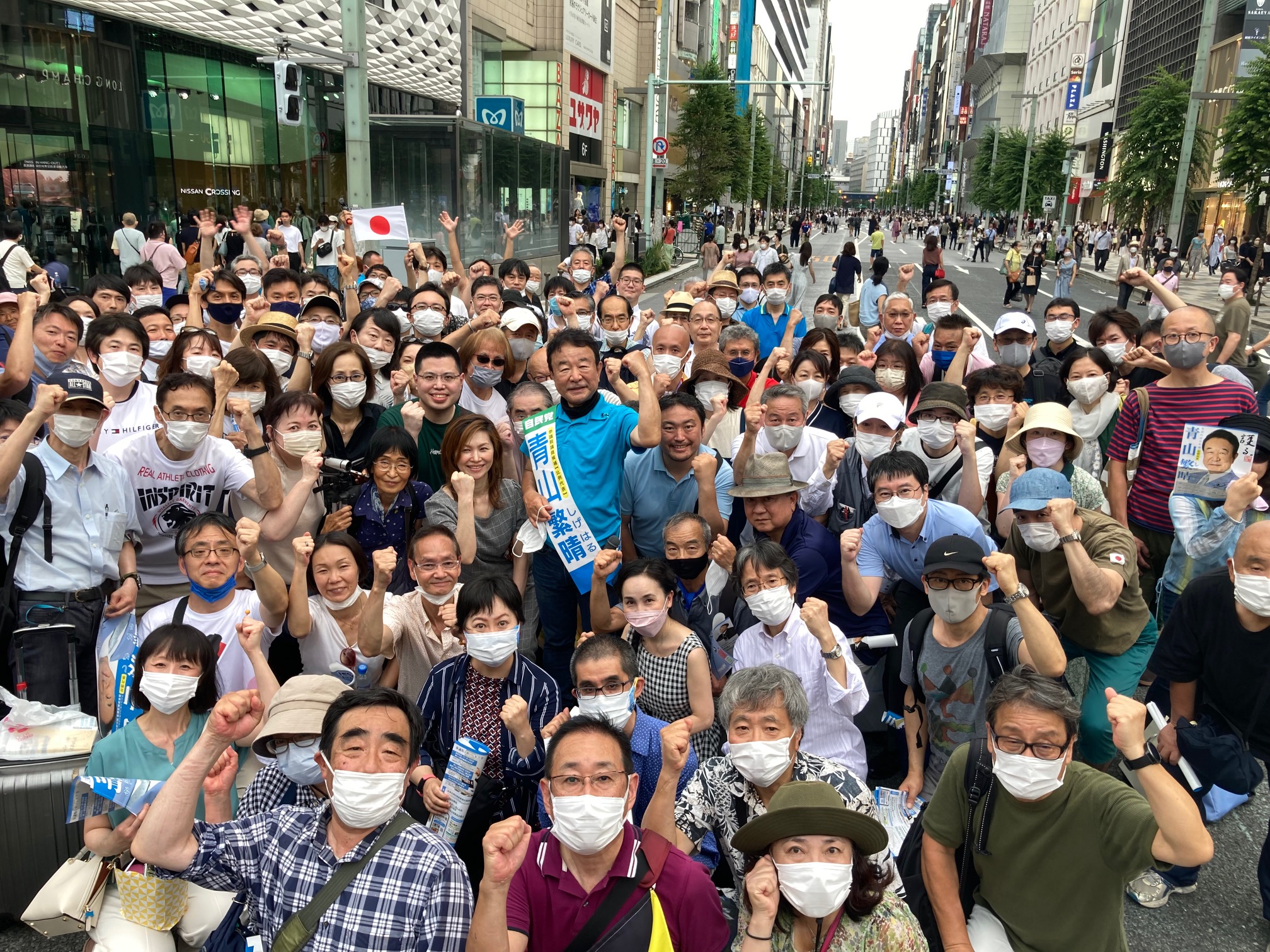 ▼7月2日土曜、歩行者天国の銀座で遊説を終わって、いつものようにグータッチ&臨時サイン会も終わってから、最後まで残ってくださったみなさんと共に、連帯の一枚です。