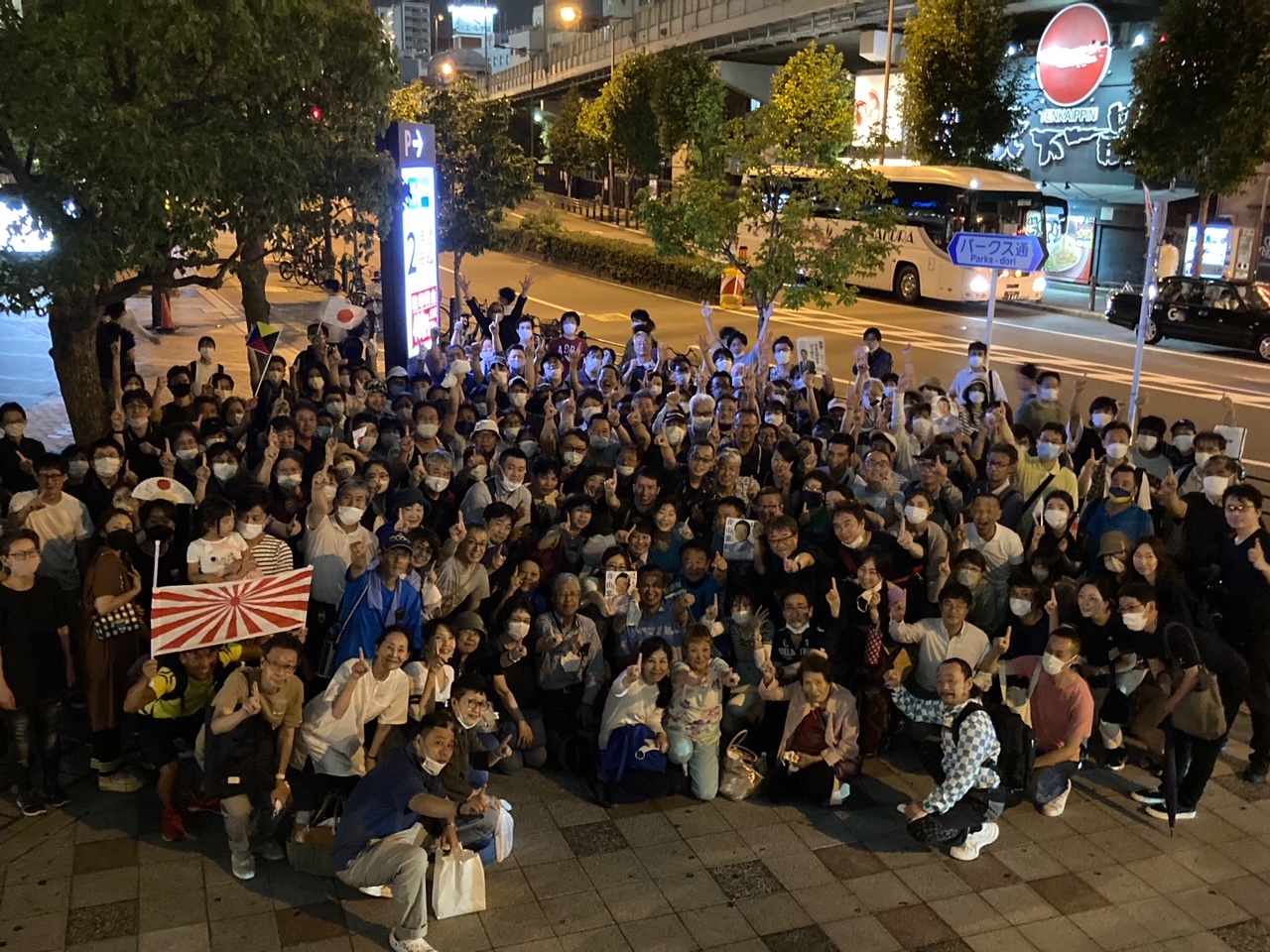 ▼ここでの演説を、上記のように19時で終えたあと、この大集団で、大阪球場の跡地へ移動し、車座になっての話を、20時の直前まで致しました。