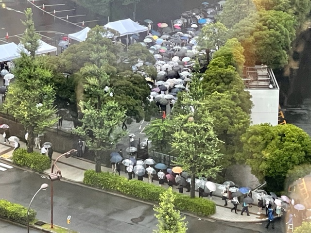 ( 強い雨のなかでも、自由民主党本部の安倍元総理への弔問の列は長く、絶えることがありません。
