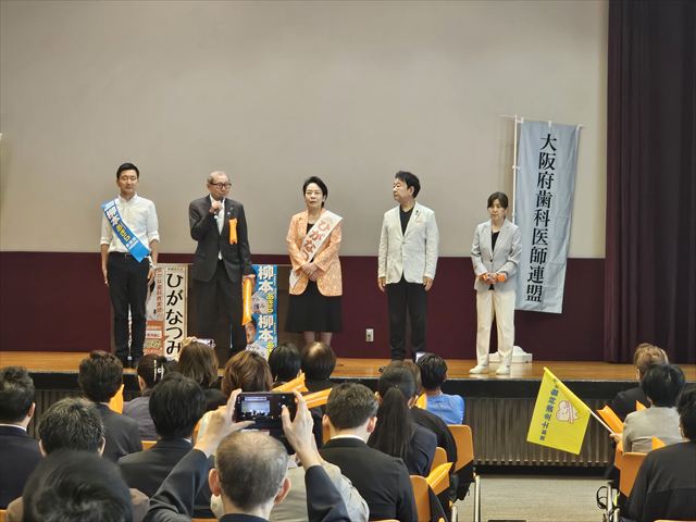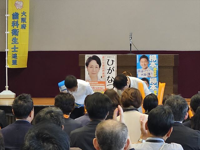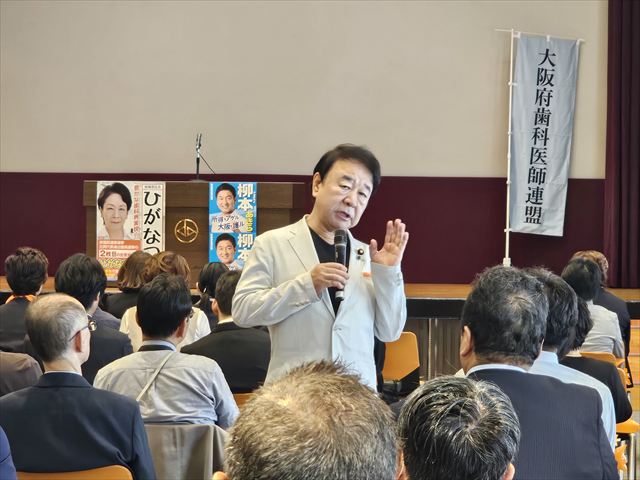 ▼歯科医師のみなさんに、大阪選挙区の候補、柳本あきらさんを紹介しました。