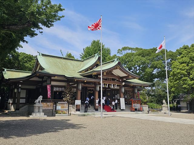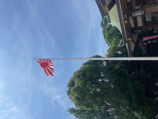 ▼護国神社を辞するとき、日本晴れに旭日の旗が翻っていました。