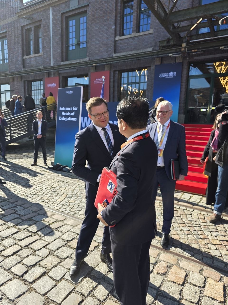 ( いまドイツ時間の4月22日水曜の朝6時過ぎです。これは昨日の朝です。大きな国際会議「Climate Dialog」の政府・国際機関の代表者の専用入り口にて、主催国ドイツのホープの政治家であるシュナイダー環境大臣が、駆け寄って迎えてくれました。シュナイダーさんとは去年11月のトロントのG7環境大臣会合で直に英語で話し込んでから、気持ちの良い信頼関係があります。ベルリン弾丸出張の主権者のみなさんへの報告は、ひとつまえのエントリーから始まっています )