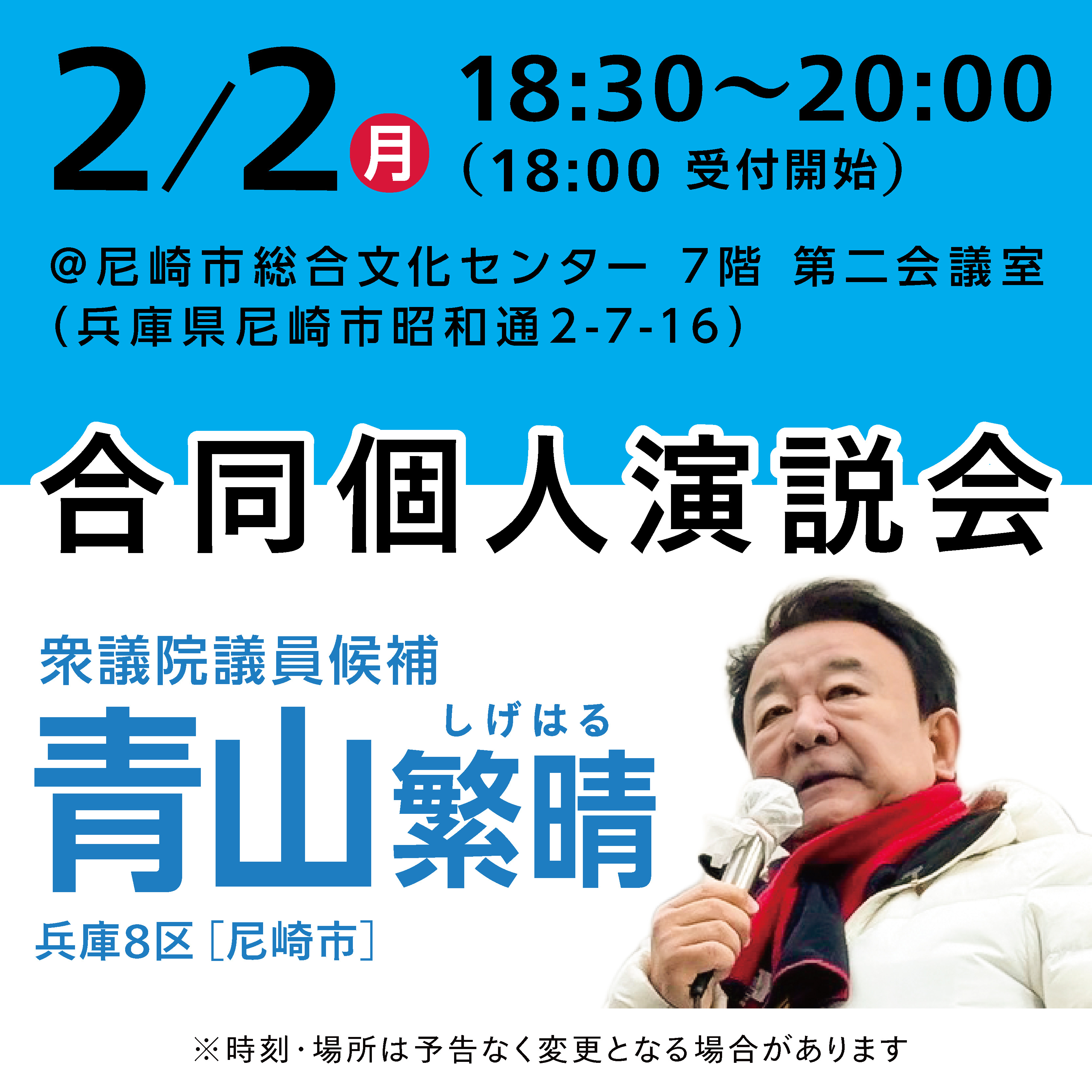 場所を事前にお知らせせずに、青山が尼崎の各地で演説を行います!