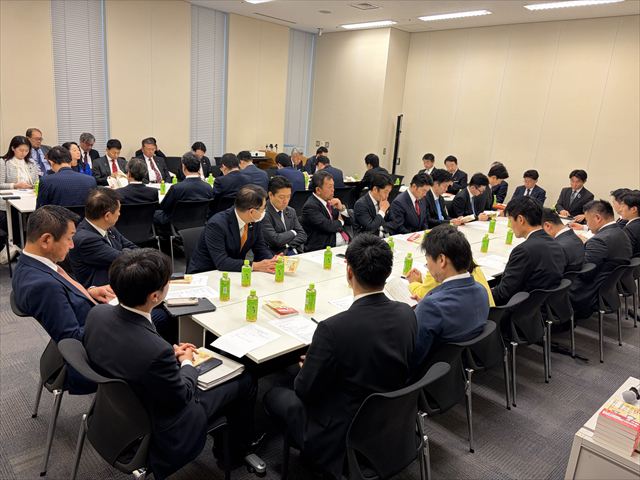 写真の雛壇の左から、佐々木紀・幹事長 ( 衆院議員 ) 、代表の不肖わたし ( 衆院議員 ) 、山田宏・副代表 ( 参院議員 ) 、鬼木誠・副代表 ( 衆院議員 ) 、石橋林太郎・事務局長 ( 衆院議員 ) です。